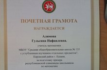 Поздравляем учителя начальных классов Алимову Гульсину Нафаилевну с призовым местом ученика на республиканской олимпиаде школьников по математике