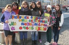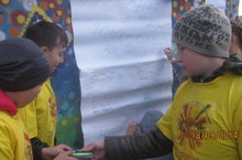 Отряд "Машина времени" участвовала в очередной акции "Подари себе улыбку". СМС-дети возле ТД "Кольцо" дарили людям улыбку и конфеты.