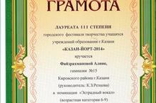 Грамоту лауреата III степени городского фестиваля творчества учащихся учреждений образования г.Казани "Казан-Йорт-2014" вручили Файзрахмановой Алине (рук.Резцова К.З.) в номинации "Эстрадный вокал"