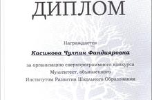 Дипломом наградили Касимову Чулпан Фандияровну за организацию сверхпрограммного конкурса Мультитест, объявленного Институтом Развития Школьного Образования.