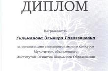 Дипломом наградили Гильманову Эльмиру Газиззяновну за организацию сверхпрограммного конкурса Мультитест, объявленного Институтом Развития Школьного Образования.