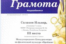Грамотой наградили Салахова Ильвира за III место в Международном Конкурсе-игре по физической культуре "Орленок".