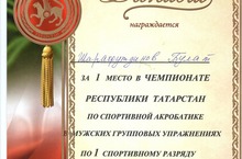 Дипломом наградили Шарафутдинова Булата (ученик 4а класса) за 1 место в чемпионате республики Татарстан по спортивной акробатике в мужских групповых упражнениях по 1 спортивному разряду.
