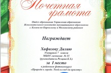 Ученицу 7 класса Хафизову Дилию (рук. Резцова К.З.) наградили почетной грамотой за I место в районном фотоконкурсе "Природа в городе. Твой взгляд на красоту"
