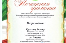 Ученицу 8б класса Яруллину Ралину (рук. Резцова К.З.) наградили почетной грамотой за I место в районном фотоконкурсе "Природа в городе. Твой взгляд на красоту"