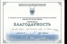 За активное участие в Республиканском антинаркотическом месячнике "Жизнь без наркотиков" объявляется благодарность Валеевой Айгуль. Благодарность вручил прокурор Республики Татарстан И.С.Нафиков