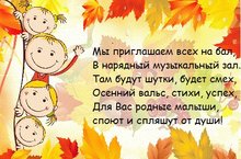 В дошкольных учреждениях в это время года традиционно проходят праздники - осенние балы утренники.Цели проведения осеннего бала в детском саду: привить любовь к окружающему миру; развить способность общаться в коллективе, играть и веселиться сообща; развивать творческие способности.