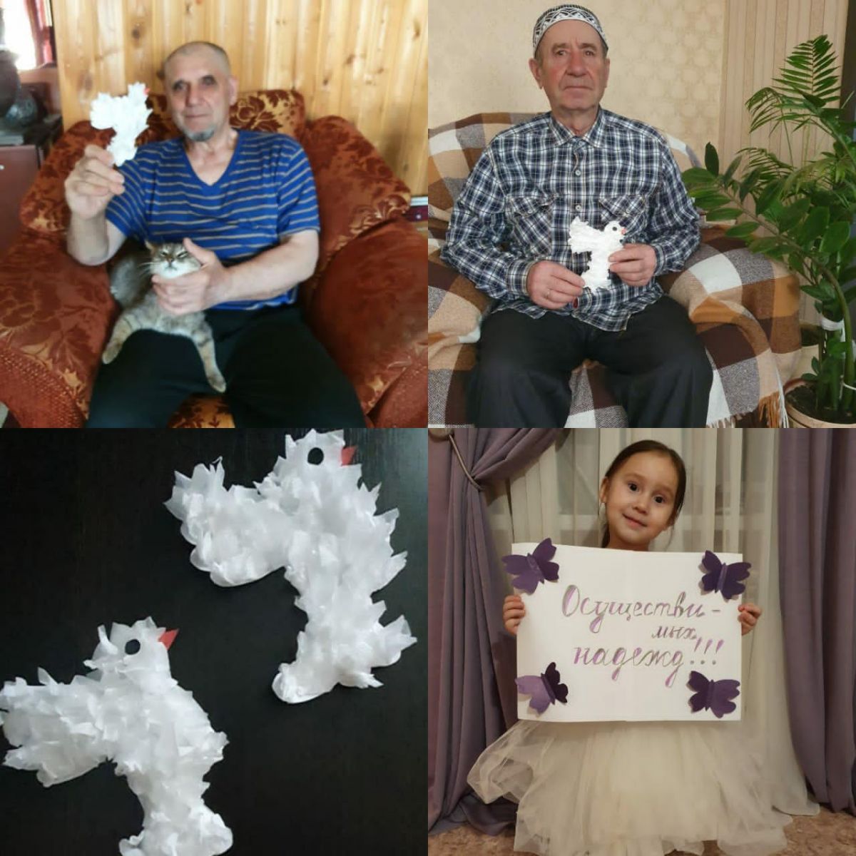 Воспитанники старших и подготовительных групп совместно с педагогами изготовили своими руками объемные поделки в виде белых голубей, а также подготовили поздравительные плакаты для своих любимых бабушек и дедушек в честь праздника «День пожилого человека»