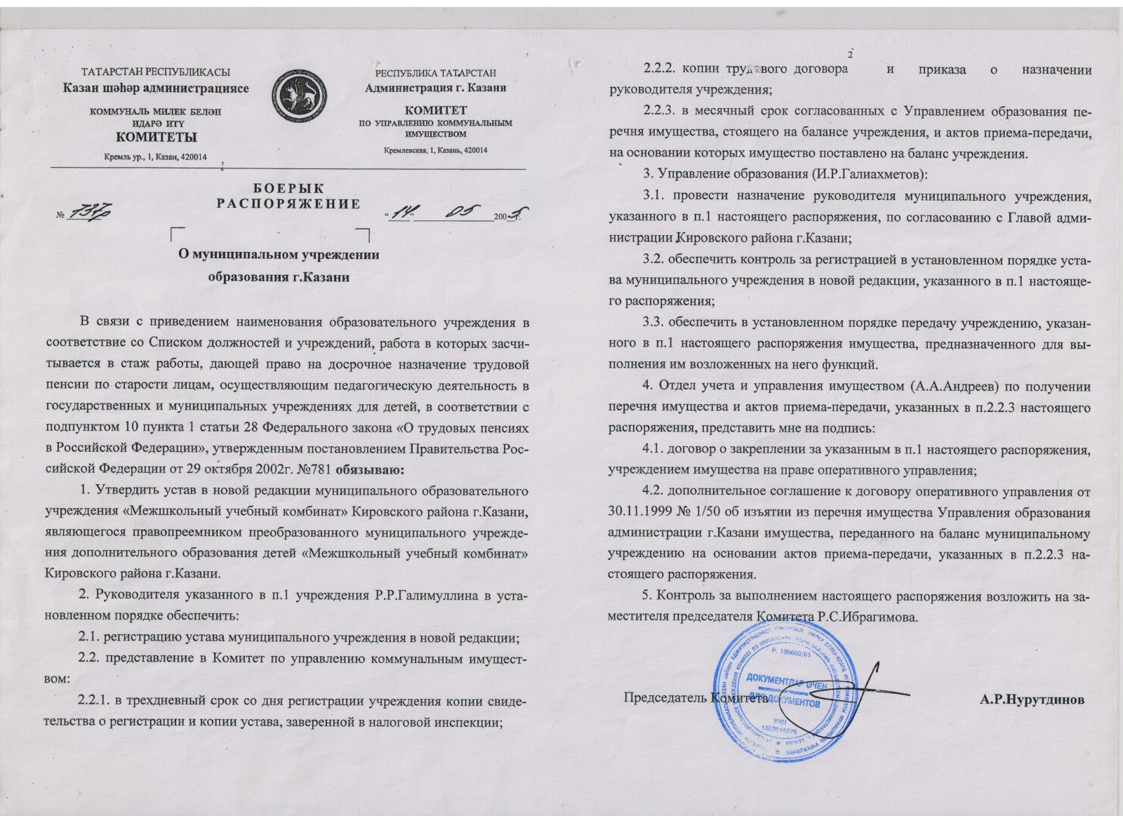 Распоряжение № 137 от 14.05.2005 года "О муниципальном учреждении образования г. Казани