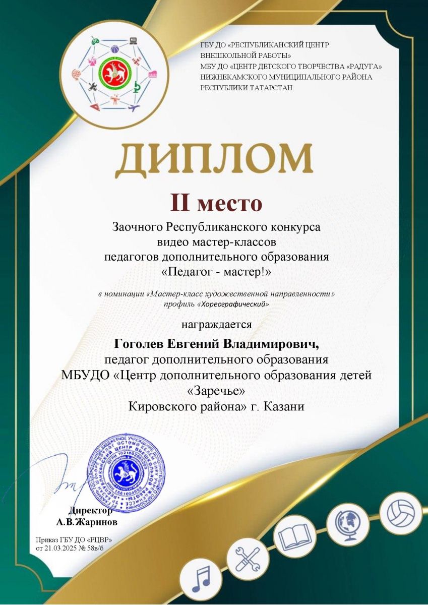 Пдо отдела «Хореография» Гоголев Евгений Владимирович принял участие в Республиканском конкурсе «Педагог — мастер» в номинации «Мастер-класс» и занял достойное 2 место. Поздравляем и желаем дальнейших творческих успехов!
