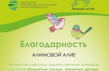 Работы юных художников изостудии " Оранжевое небо" Ситновой Ксении, Заляевой Азалии, Алимовой Алии (педагог Заляева Резеда Рашидовна) приняли участие во Всероссийском конкурсе рисунков "Крылатые соседи, пернатые друзья". Организатор мероприятия - Министерство природных ресурсов и экологии РФ и Национальный Парк " Лосиный остров".