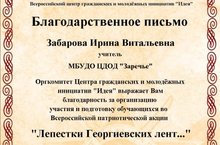 Педагог нашего Центра Забарова И.В. и учащийся объединения " Юные натуралисты - экологи" Батуллин Дмитрий приняли участие во Всероссийской патриотической акции " Лепестки Георгиевских лент...." .