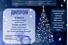 Поздравляем Ромачева Ивана, учащегося объединения "Светлячок" с 3 местом в региональном творческом конкурсе "Зимние фантазии"! Педагог Костюхина Л.Л.