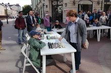 Вчера на ул.Баумана кроссы давали сеанс одновременной игры в трех группах. Наши ребята тоже участвовали получили призы-крутые книги. На первом плане вице чемпионка мира по шахматам Алиса Галямова играет с нашим учащимся из объединения «Шахматы» (педагог Соловьев М.М.) Антоном Бородиным.