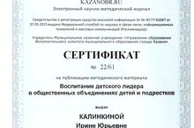 Педагог дополнительного образования ЦДОД "Заречье" Калинкина Ирина Юрьевна опубликовала методический материал "Воспитание детского лидера в общественных объединениях детей и подростков " в электронном научно - методическом журнале KAZANOBR.RU .Обмен опытом по развитию детского движения в Кировском районе , является интересным и полезным.На страницах электронного научно - методического журнала KAZANOBR.RU можно найти много интересных тем и идей для развития педагогической деятельности .Важно идти в ногу со временем.