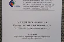 27-28 марта 2019 в Казанском государственном университете, на базе института психологии и образования прошла Всероссийская научно-практической конференция с международным участием " IV Андреевские чтения" на тему "Современные концепции и технологии творческого саморазвития личности". С конференции приняла участие педагог дополнительного образования Агаджанян Е.В.