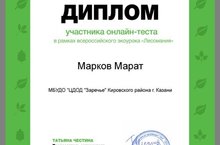 Марков Марат, учащийся объединения "Хранители Земли" (педагог Низамова А.Х.) стал дипломантом викторины в рамках Всероссийского экоурока Лесомания.
