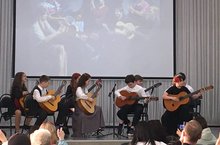 В объединении «Юный гитарист» под руководством педагога Галиахметовой А.Р. по итогам года прошёл отчётный концерт. Все, кто присутствовал на этом ярком празднике, соприкоснулись с удивительным миром музыки, окунулись в прекрасный и неповторимый мир искусства. Участники радовали зрителей как сольным выступлением, так и ансамблевым исполнительством. Концерт прошёл в доброй и непринуждённой обстановке
