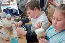 В честь светлого дня Пасхи ребята из объединения "Творчество без границ" (педагог Кузнецова Ольга Валерьевна) создавали работы на пасхальную тематику. Из ваты получились аппетитные куличи и забавные цыплята