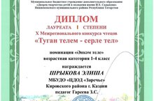 Обучающихся объединения «Художественное слово» под руководством педагога Гареева Зифа Сагитовна приняли участие в X Межрегиональном конкурсе чтецов «Туган телем-серле тел» и стали лауреатами:
