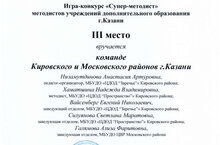 Сегодня на базе МБУДО "Центр внешкольной работы" Приволжского района г. Казани прошла ежегодная городская игра-конкурс "Супер методист". Команда методистов многопрофильных Центров Кировского и Московского районов, успешно пройдя все конкурсные испытания, показала достойные результаты, обеспечившие ей почётное III место. Особо была отмечена творческая визитка, посвящённая Году Педагога и Наставника.
