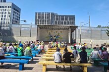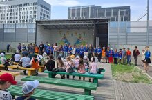 120 детей из пришкольных лагерей смотрят спектакль, играют в игры и отвечают на вопросы викторины!