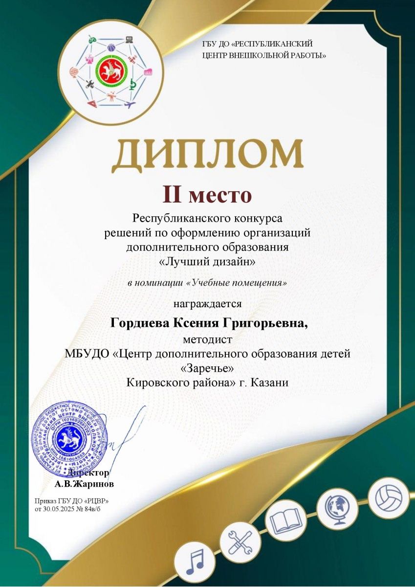 В номинации «Учебные помещения» был представлен кабинет «Шахматы» и по результатам конкурса 2 место заняла методист Центра Заречье — Гордиева Ксения Григорьевна.