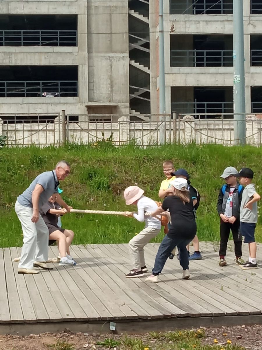 Ребята с удовольствием перетягивали канат, лавировали клюшкой и мячом между кеглями, играли в «воздушное кенгуру».