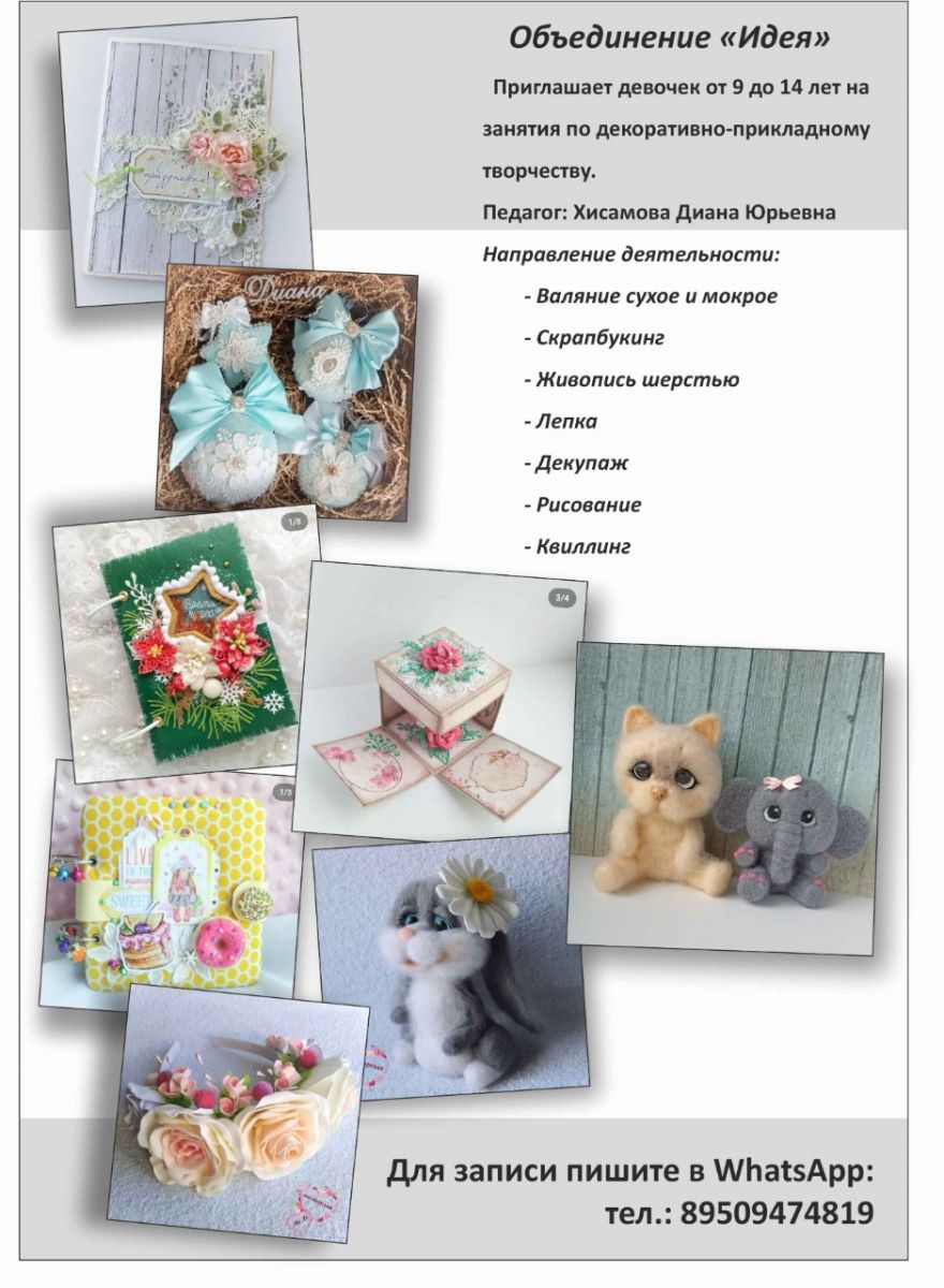 Опубликовано: 23.11.2022Объединение "Идея" объявляет набор девочек с 9 лет для занятий декоративно-прикладным творчеством. Занятия проходят с 16:00-18:00 вторник и четверг по адресу: ул. Окольная, 23