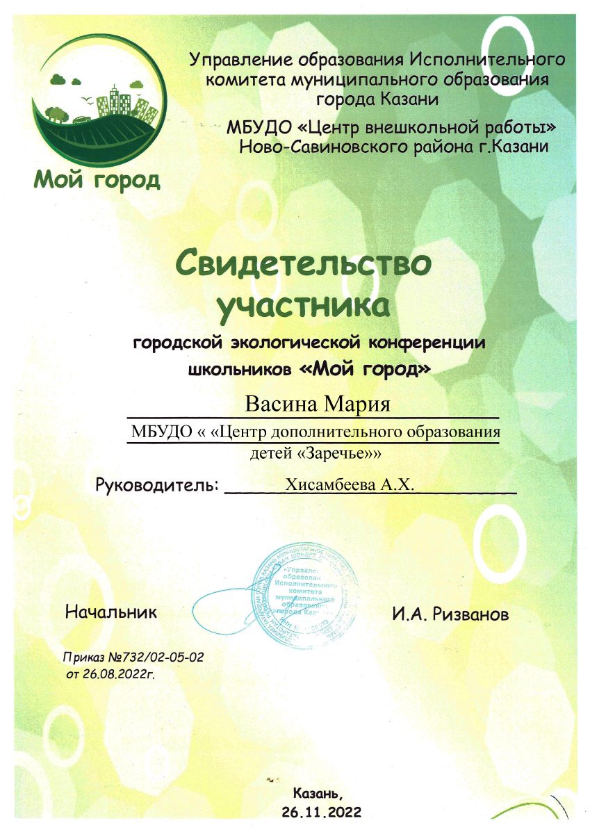 Опубликовано: 30.11.2022Учащаяся объединения «Исследователи природы» Васина Мария приняла участие в городской экологической конференции «Мой город» с проектом «Чистое озеро — залог здорового отдыха жителей «Салават Купере».