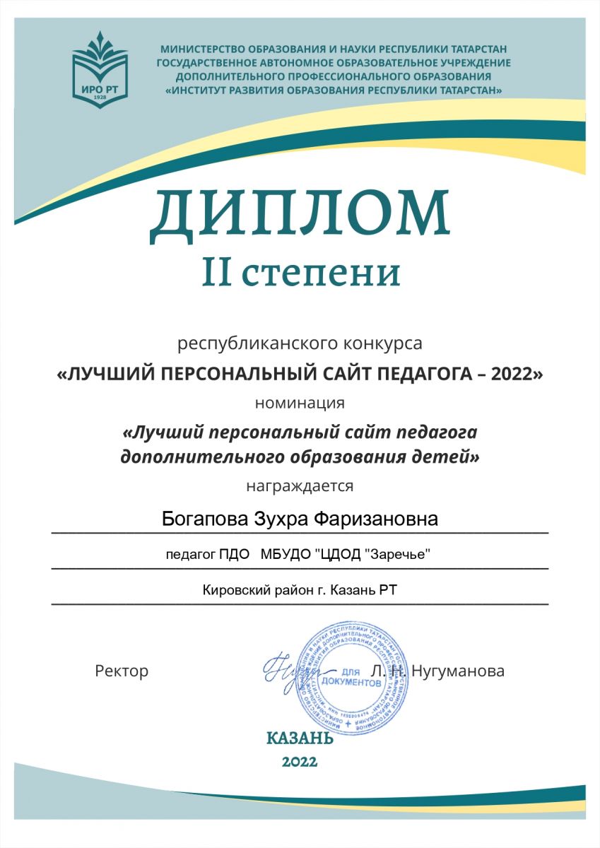 Поздравляем нашего педагога Богапову Зухру Фаризановну с победой в Республиканском конкурсе «Лучший персональный сайт педагога - 2022» в номинации Дополнительное образование