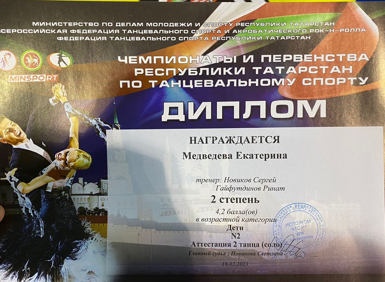 Опубликовано: 20.02.2023Поздравляем Медведеву Екатерину с призовым местом в Чемпионате и первенстве Республики Татарстан по танцевальному спорту. Объединение "Свей" педагог Гайфутдинов Р.Н.