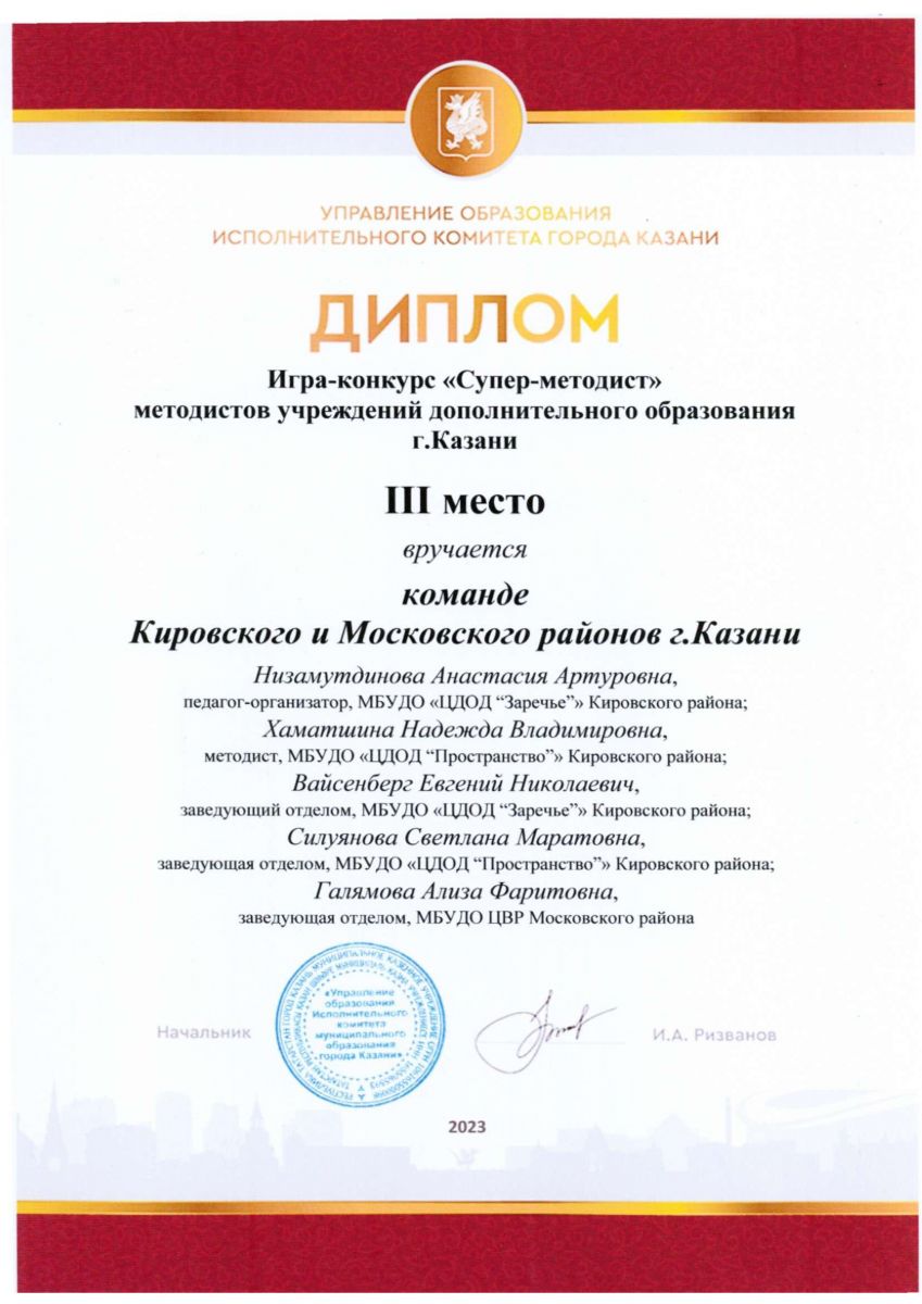 Опубликовано: 21.03.2023Сегодня на базе МБУДО "Центр внешкольной работы" Приволжского района г. Казани прошла ежегодная городская игра-конкурс "Супер методист". Команда методистов многопрофильных Центров Кировского и Московского районов, успешно пройдя все конкурсные испытания, показала достойные результаты, обеспечившие ей почётное III место. Особо была отмечена творческая визитка, посвящённая Году Педагога и Наставника.