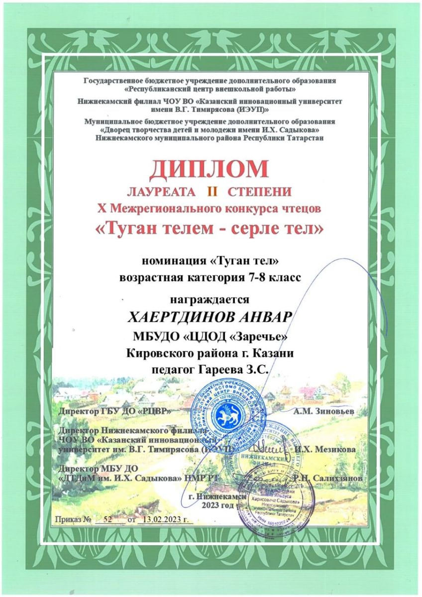 Опубликовано: 19.04.2023Обучающихся объединения «Художественное слово» под руководством педагога Гареева Зифа Сагитовна приняли участие в X Межрегиональном конкурсе чтецов «Туган телем-серле тел» и стали лауреатами: