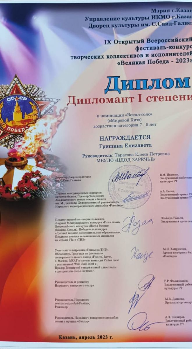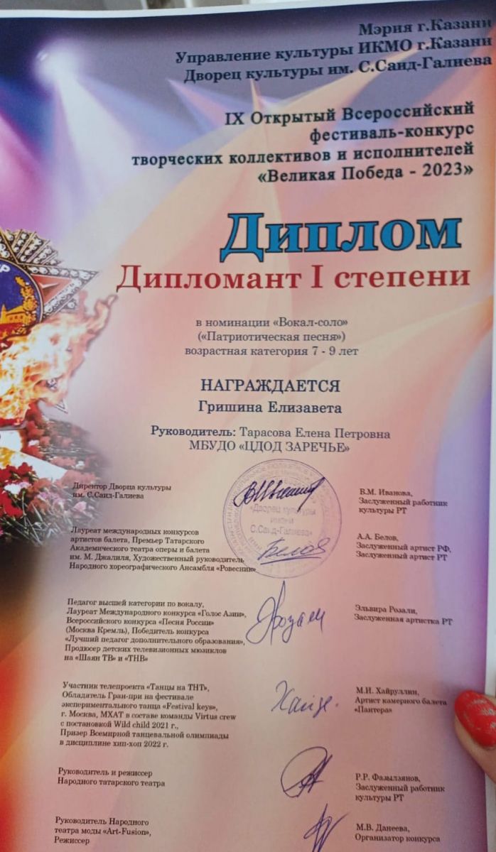 Опубликовано: 24.04.202322 апреля солисты вокального объединения "Исток" (педагог Тарасова Е.П.) приняли участие во Всероссийском фестивале-конкурсе "Великая Победа - 2023", который проходил в ДК им. С. Саид-Галиева.