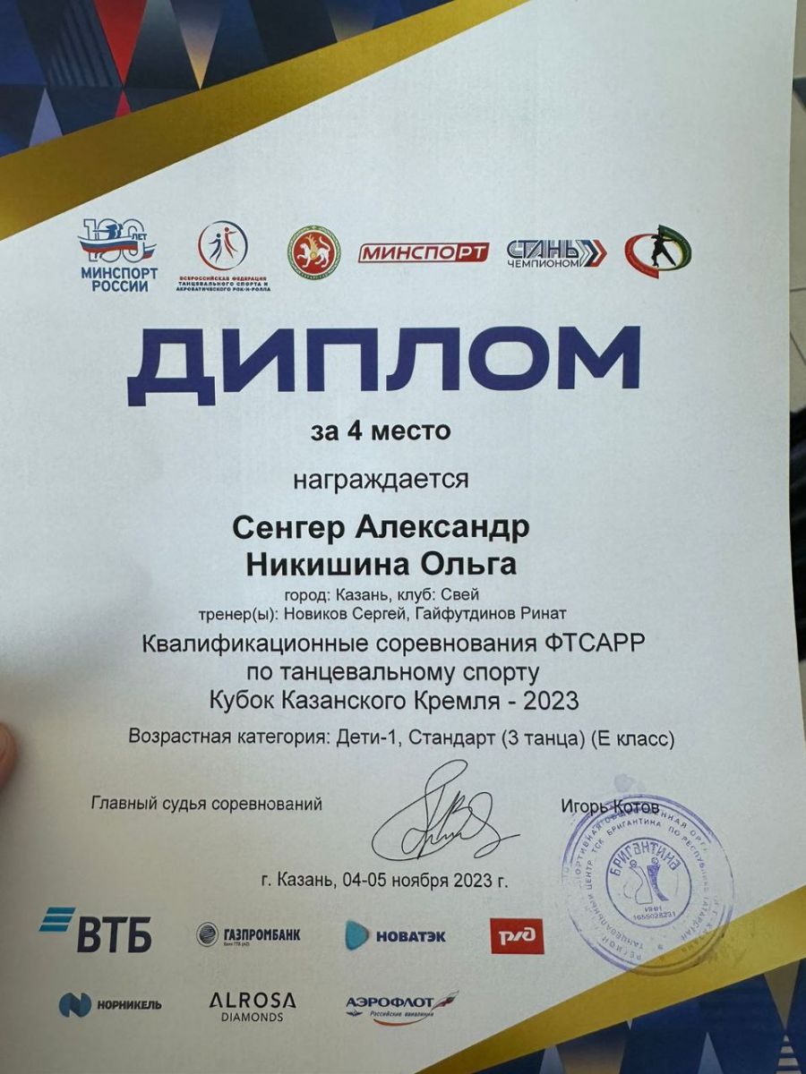 Опубликовано: 07.11.2023Поздравляем учащихся ТСК СВЕЙ Сенгер Александра и Никишину Ольгу с победой в Квалифицированных соревнованиях ФТСАРР по танцевальному спорту "Кубок Казанского Кремля - 2023"