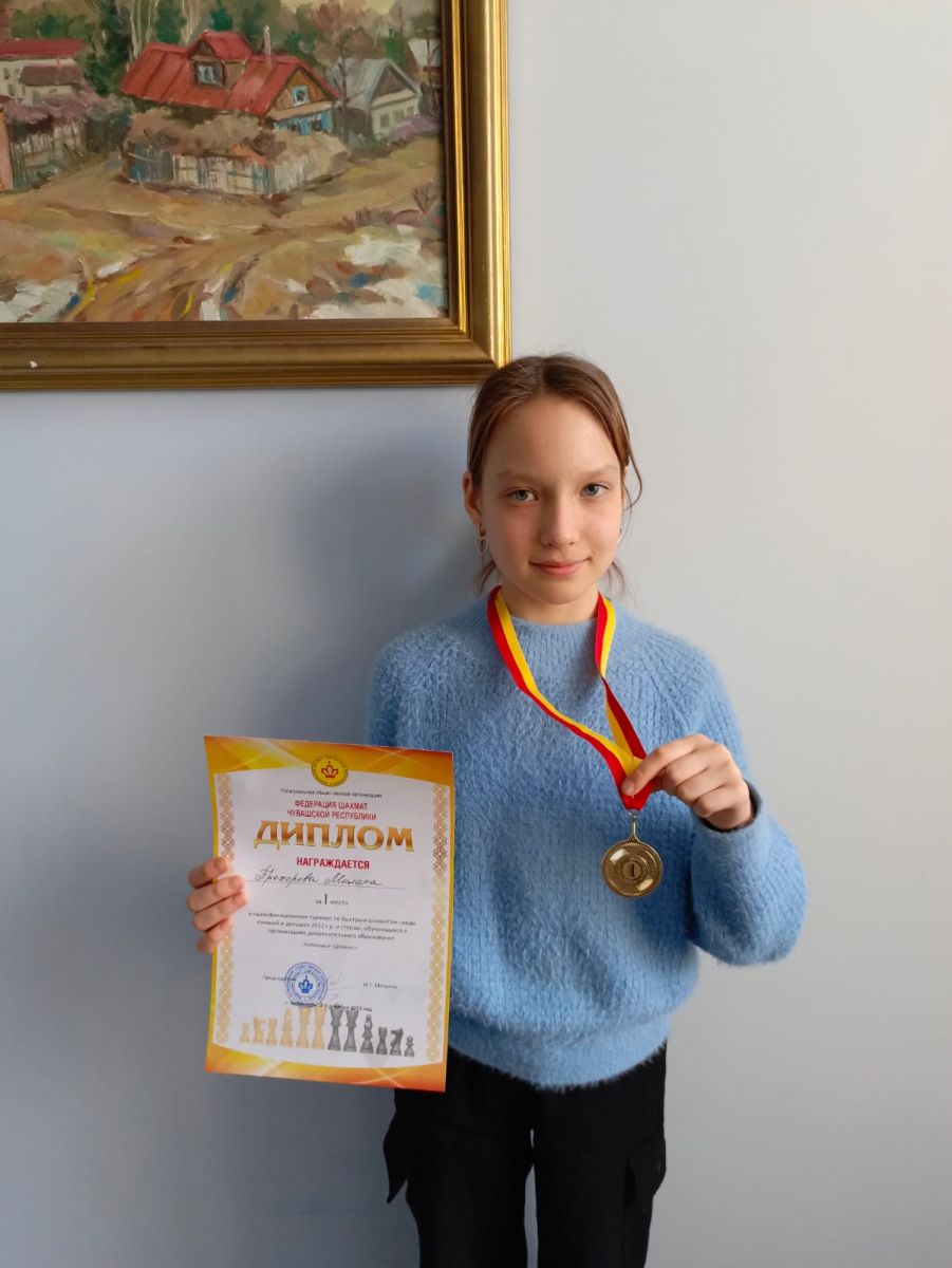 Опубликовано: 04.12.2023Поздравляем Прохорову Милану из объединения «Шахматы» (педагог Масалимов Рим Аглямович) с победой на Всероссийском квалифицированном турнире по быстрым шахматам (г. Чебоксары). Желаем дальнейших побед! Молодцы!