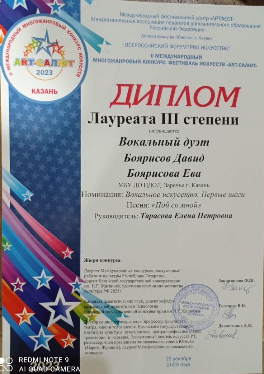 Дуэт вокальной студии Исток - Давида и Еву Боярисовых, занявших 3 место в Международном конкурсе "Арт-Салют". Педагог Тарасова Елена Петровна.