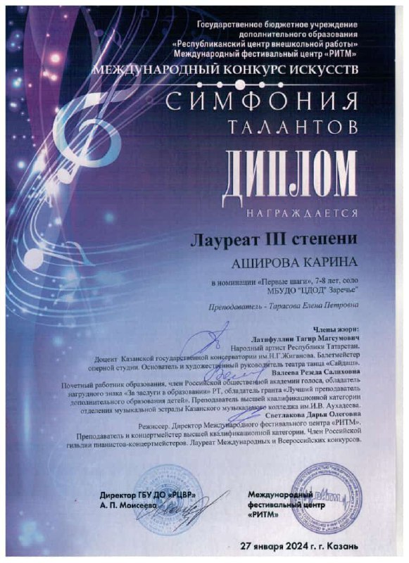 Опубликовано: 28.01.2024Поздравляем Карину и пдо Тарасову Е.П. с очередной победой в Международном конкурсе "Симфония талантов". Желаем дальнейших творческих успехов.