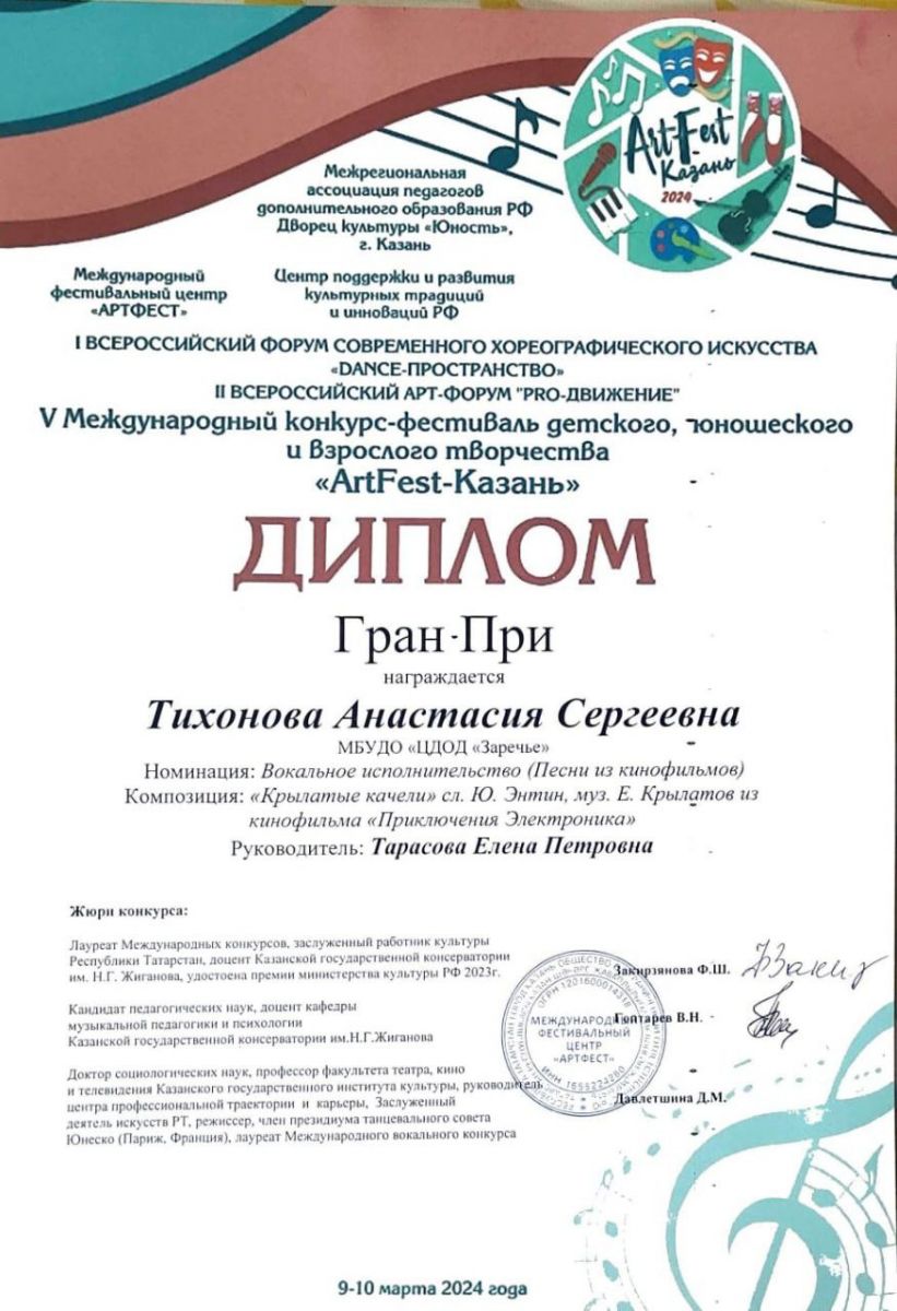 Опубликовано: 11.03.2024В Казани прошёл конкурс "ArtFest Казань". Гран-При у обучающейся объединения "Исток" (пдо Тарасова Е.П.). Поздравляем и желаем дальнейших творческих успехов!