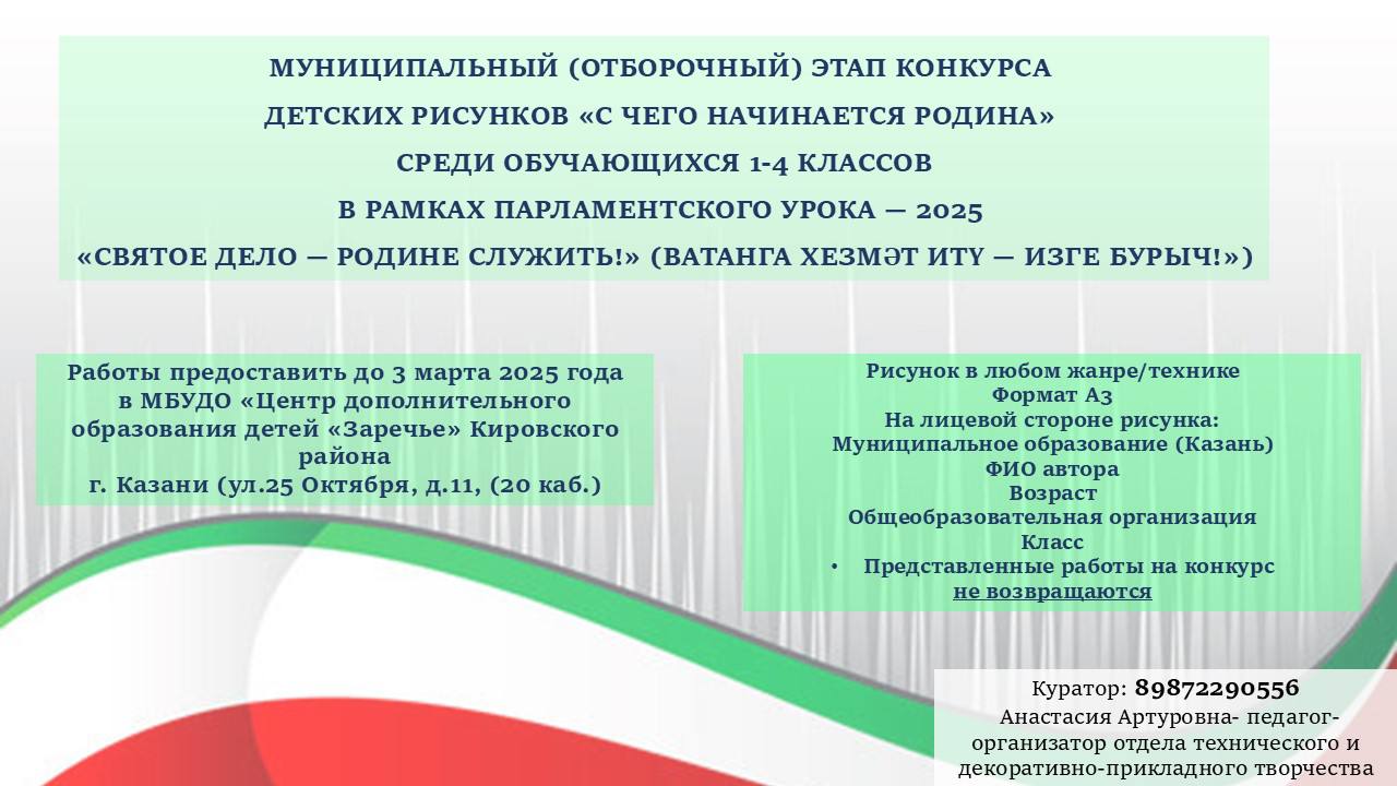 Опубликовано: 14.02.2025Муниципальный (отборочный) этап конкурса детских рисунков «С чего начинается Родина» в рамках Парламентского урока – 2025 «Святое дело – Родине служить!» среди учащихся 1-4 классов общеобразовательных организаций Республики Татарстан