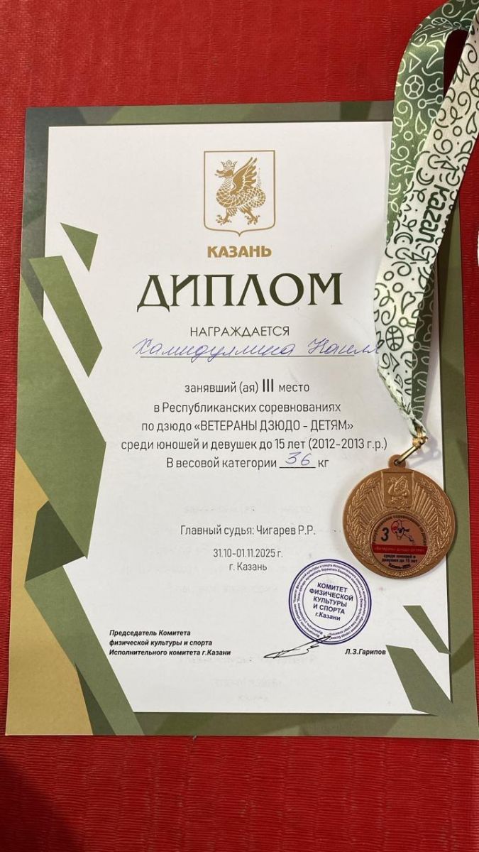 Опубликовано: 03.11.2025Мы гордимся нашими юными спортсменами! На республиканских соревнованиях среди юношей и девушек до 15 лет Хамидуллина Наиля завоевала бронзовую медаль!