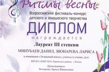 Минубаев Данил и Звонарёва Лариса Витальевна в дуэте стали Лауреатами III степени Всероссийского фестиваля-конкурса детского и юношеского творчества "Ритмы весны". Минубаев Данил и Волостнова Арина - Дипломанты I степени. Поздравляем!