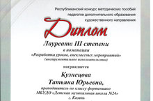 Преподаватели ДМШ №24 приняли участие в Республиканском конкурсе методических пособий педагогов дополнительного образования художественного направления. Кузнецова Татьяна Юрьевна стала Лауреатом III степени, Исхакова Гузель Равильевна получила Диплом III степени. В конкурсе также приняли участие Зотова Юлия Валерьевна и Севостьянова Надежда Анатольевна.