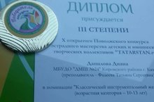 Ученица Фадеевой Татьяны Сергеевны Данилова Диана (фортепиано) получила Диплом III степени X Открытого Поволожского конкурса эстрадного мастерства детских и юношеских коллективов "TATARSTAN.ru". Поздравляем! Желаем дальнейших побед!!!