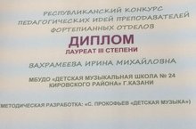 Поздравляем заместителя директора по учебно-воспитательной работе, преподавателя фортепиано Вахрамееву Ирину Михайловну с завоеванием звания Лауреата III степени на Республиканском конкурсе педагогических идей преподавателей фортепианных отделов (методическая разработка "С. Прокофьев."Детская музыка"")!!!Благодарим за труд!!!