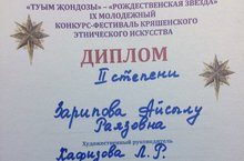 Ученица Хафизовой Лейсан Рахимзяновны Зарипова Айсылу стала обладателем Диплома II степени Всероссийского молодежного фестиваля-конкурса кряшенского этнического искусства "Туым жондызы" -"Рождественская звезда", номинация "Этнический вокал". Поздравляем! Желаем дальнейших успехов и благодарим за работу!!!