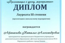 Поздравляем Афанасьеву Наталью Александровну с победой в Открытом Муниципальном конкурсе "Презентация к уроку, мероприятию". В номинации "Презентация к внеклассному мероприятию" работа Натальи Александровны была удостоена диплома Лауреата III степени! Желаем дальнейших успехов!!!