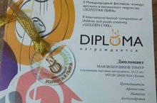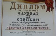 Ученик Афанасьевой Натальи Александровны Мавлюбердинов Тимур стал Дипломантом II Международного фестиваля-конкурса детского и юношеского творчества "Золотая лира" (номинация 10-12 лет). Поздравляем!!!Выражаем благодарность Афанасьевой Н.А. за работу!!!!Желаем дальнейших творческих достижений!!!