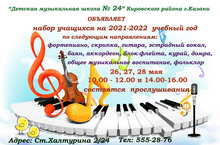 МБУДО "Детская музыкальная школа № 24" Кировского района объявляет набор учащихся от 6,5 до 12 лет на 2021-2022 учебный год на предпрофессиональные и общеразвивающие программы по специальностям: